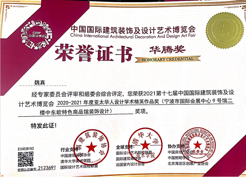 魏真(魏綺儷)教授在2021第十七屆中國國際建筑裝飾及設(shè)計藝術(shù)博覽會獲得亞太華人設(shè)計學(xué)術(shù)精英作品獎