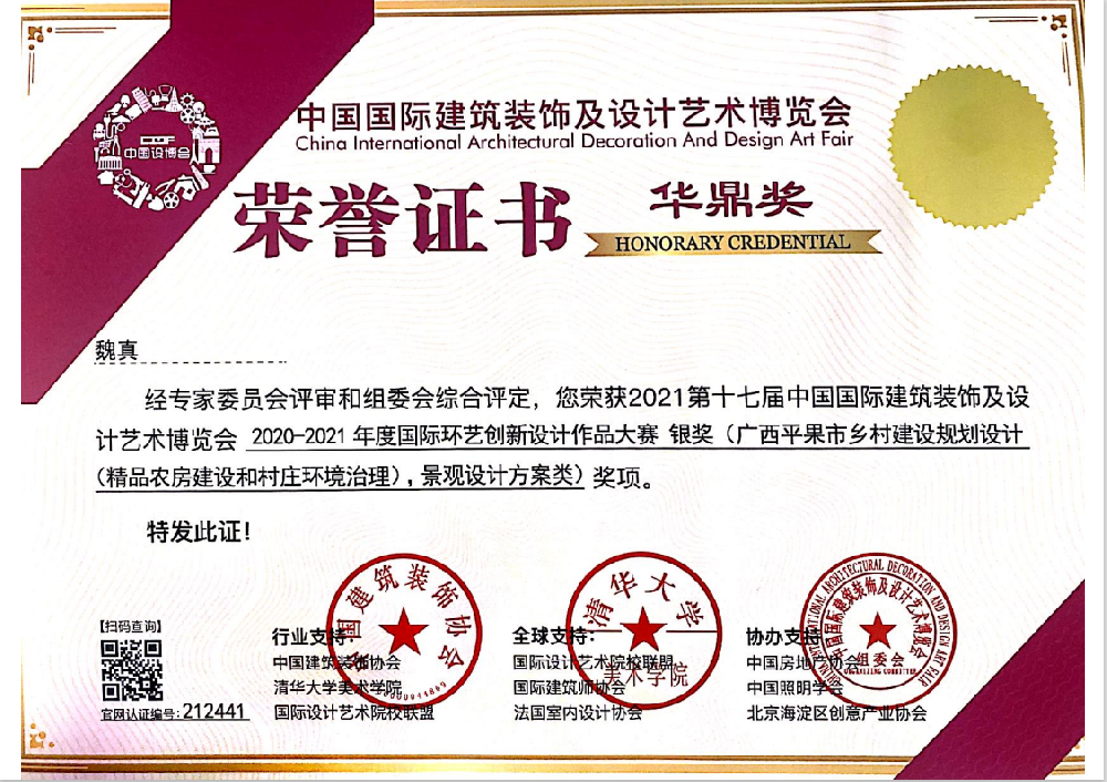 魏真(魏綺儷)教授在2021第十七屆中國國際建筑裝飾及設(shè)計藝術(shù)博覽會 國際環(huán)藝創(chuàng)新設(shè)計作品大賽 獲得銀獎