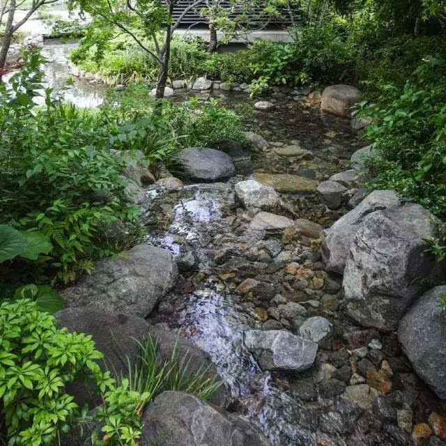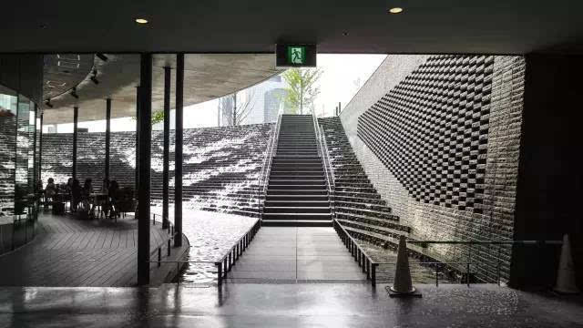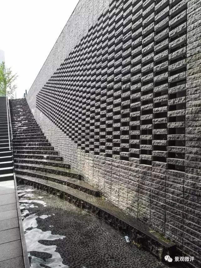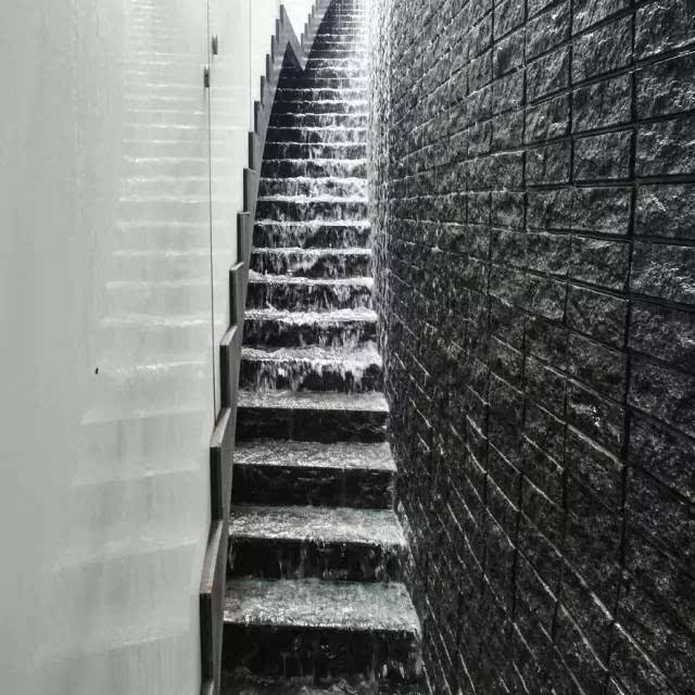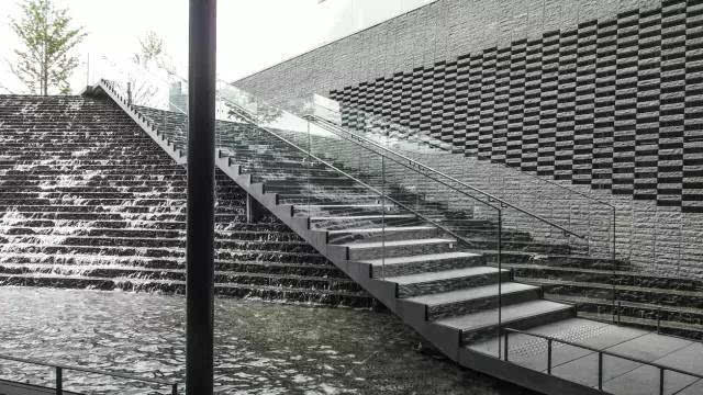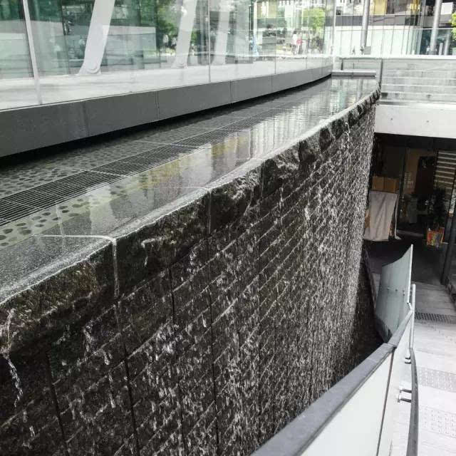 大疊水直接跌落到地鐵站的下層空間,因為下層喇叭口式的造型,無形中變成一個擴音器,把跌水的氣勢渲染的更加濃烈,猶如瀑布傾斜般壯觀!因為高差很大,底端水花的飛濺影響行人通行,所以這個區(qū)域玻璃扶手的高度、通透感、圓滑度都是經(jīng)過巧妙處理的。