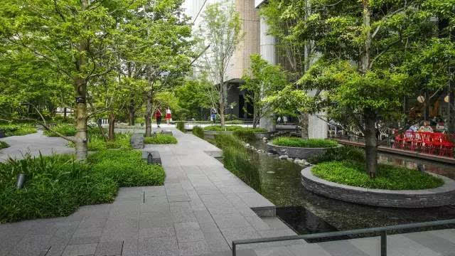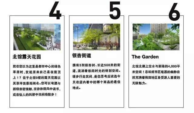 整個項目由南至北,由梅北廣場(安藤忠雄參與設計)、南館露天花園、櫸樹街道、北館露天花園、銀杏街道、The Garden組成。